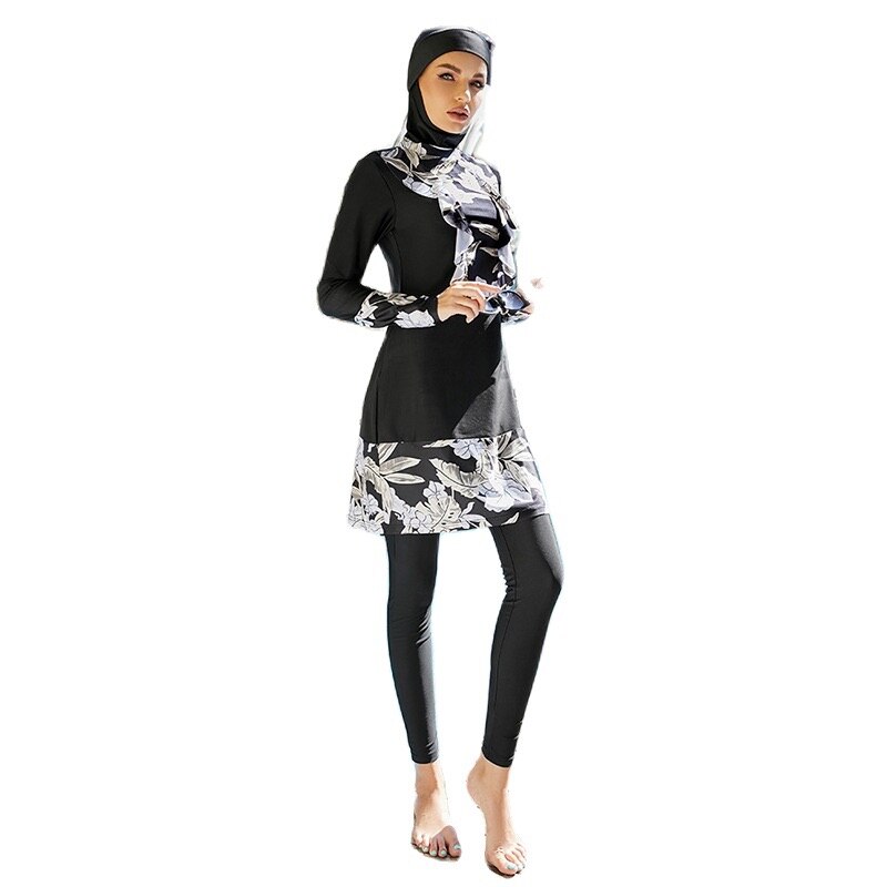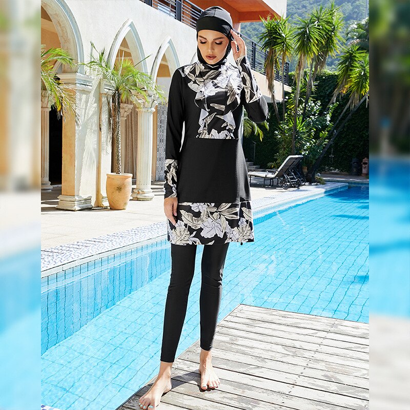Burkinis Bourkini Musulmans Plage Plus Size Conservatieve Stiksels Bloemen Printing Drie Stuk Moslim Zwemmen Pak Voor Vrouwen
